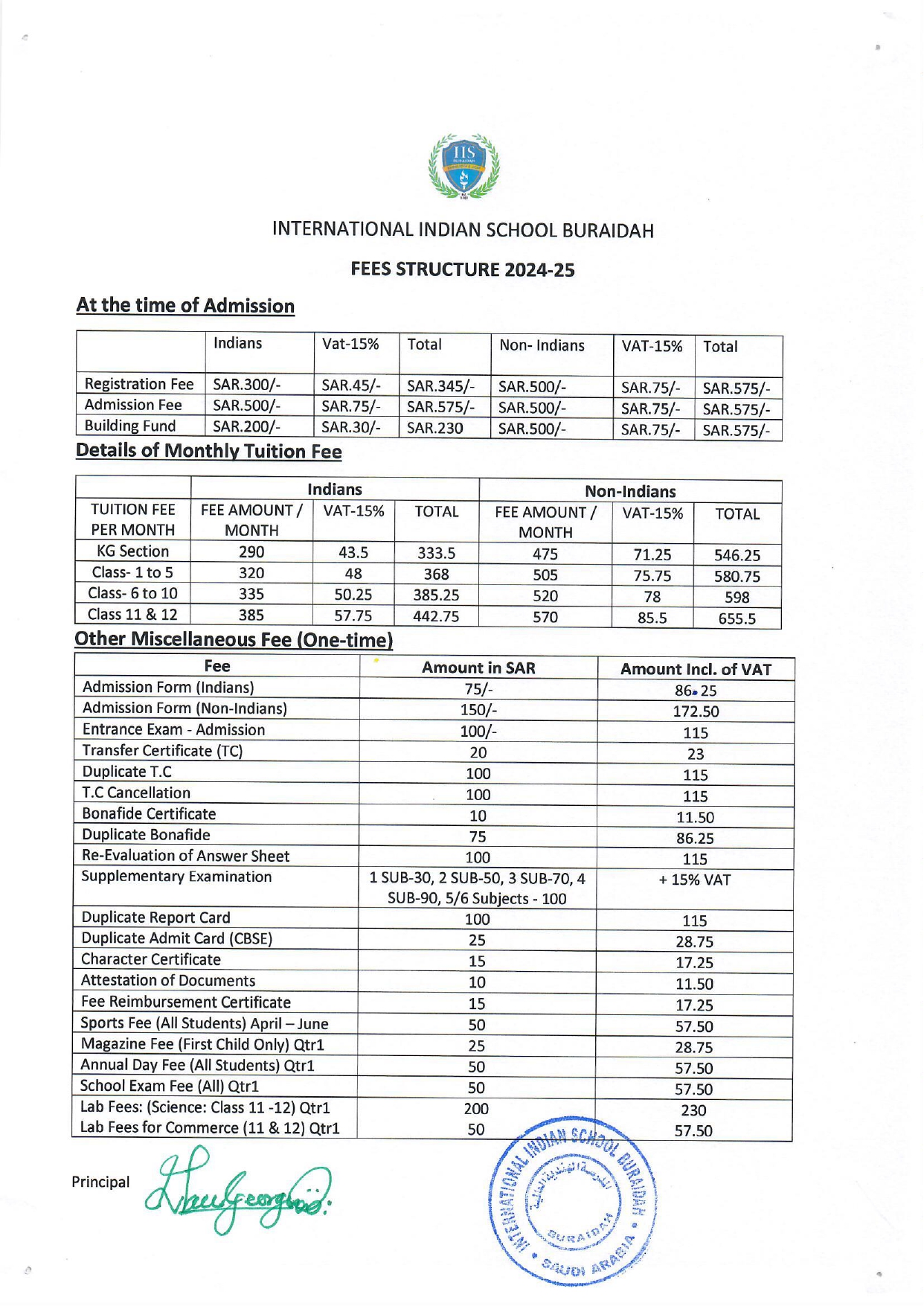 Interview will be conducted for KG Sections. Entrance Test will be conducted in English, Hindi and Mathematics for Indians and English and Mathematics for Non-Indians for all the classes from Std I upward, an amount of SR 50/- along with applicable VAT is to be paid towards Entrance Test. This is a non refundable fee.